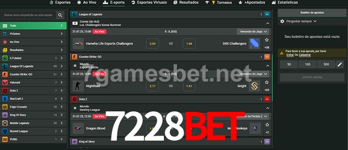 O 7228Bet oferece uma grande seleção de opções de apostas em e-sports com probabilidades competitivas